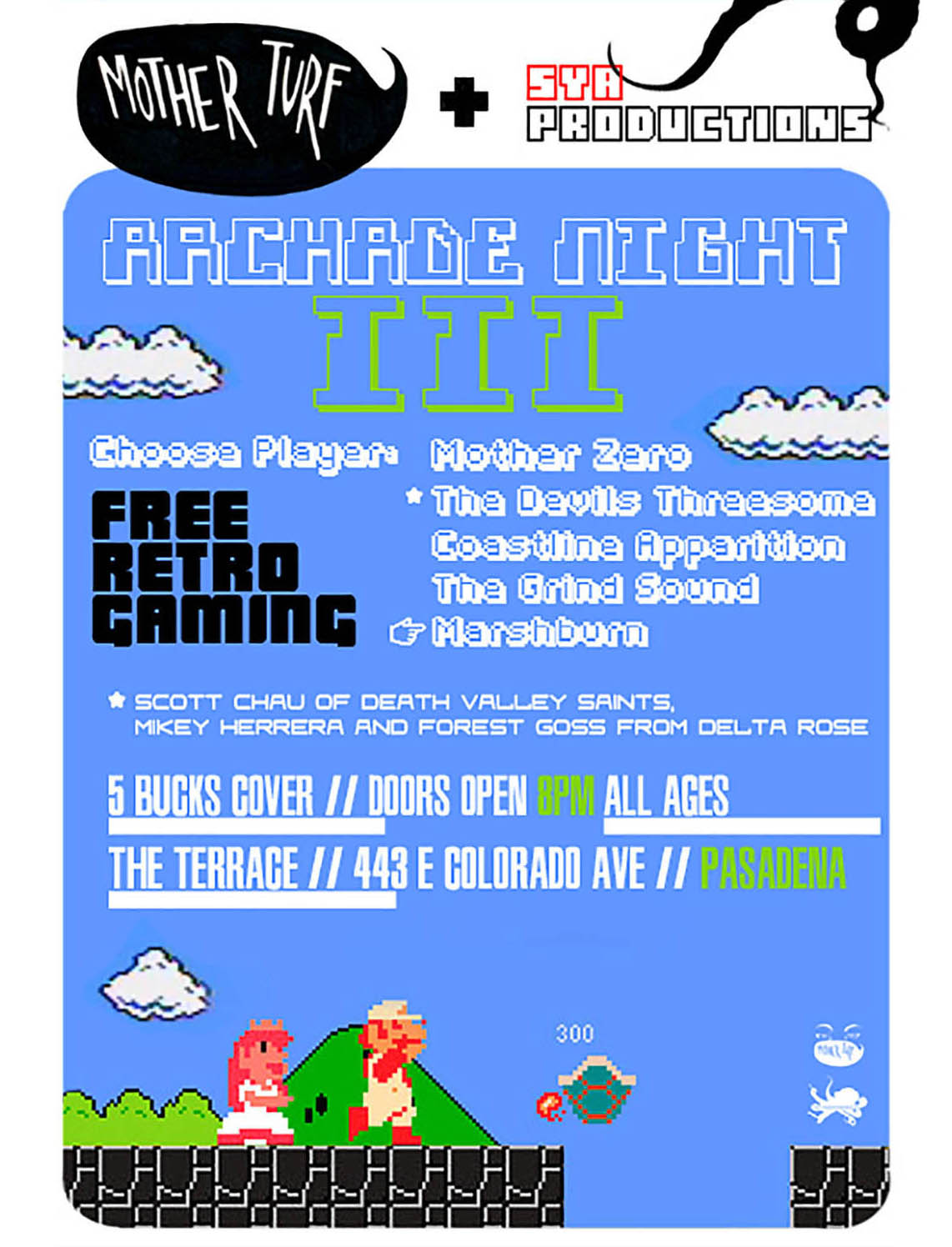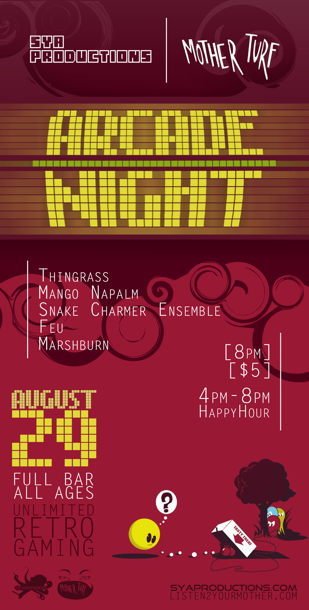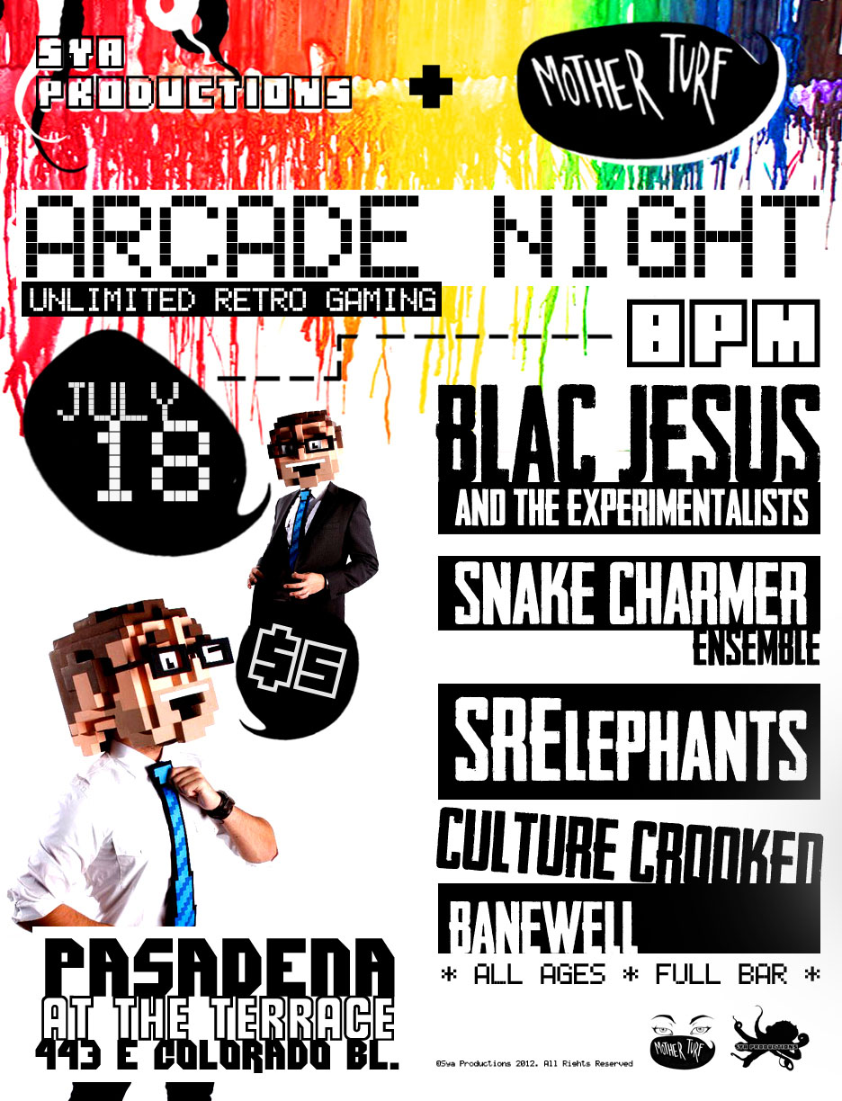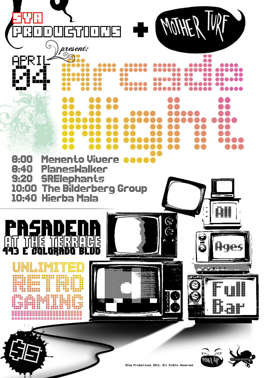 Samples of the "Arcade Night" flyer designs can be seen below, in addition to other promoted events.